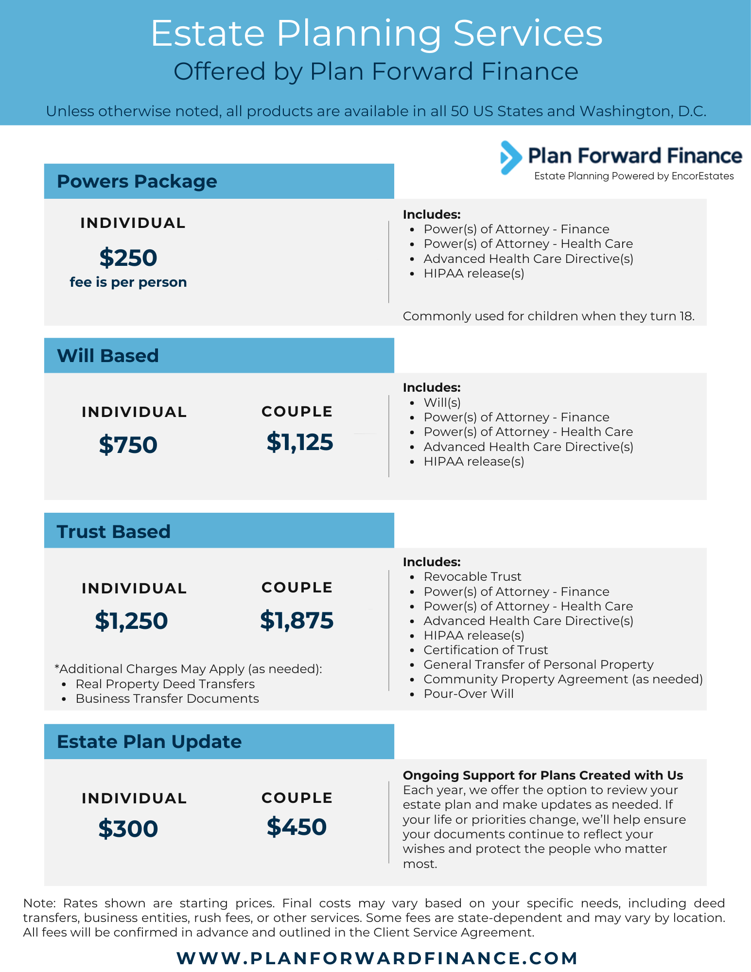 At Plan Forward Finance, we believe pricing should be as clear and approachable as the planning process itself. Whether you’re building your first estate plan, organizing your financial life, or navigating a life transition, we offer support that meets you where you are. Our services are available at flat rates, hourly rates, or project-based fees. Everything is agreed on in advance, with no pressure and no surprises.